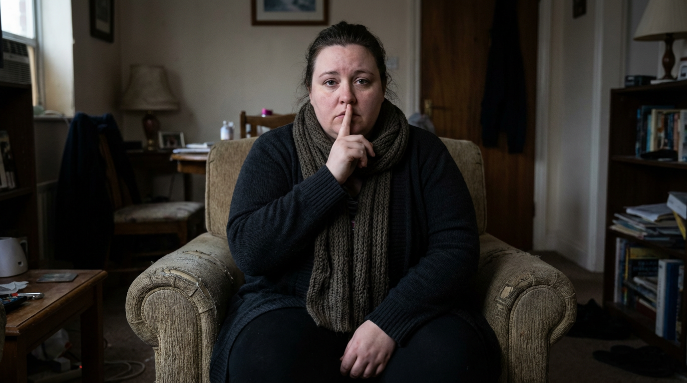 A sad, isolated woman shushes the camera. (Runway AI)